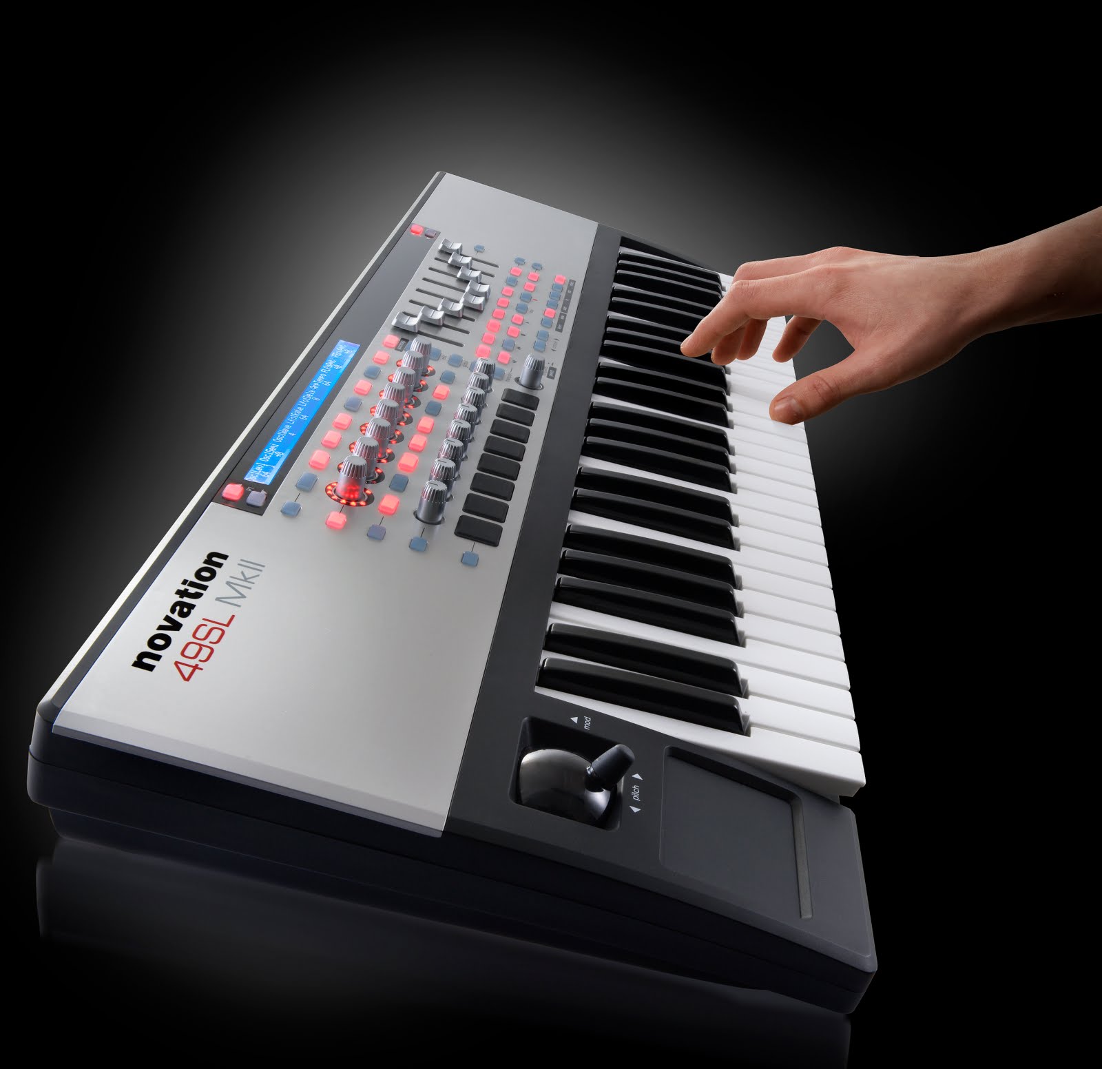 Novation 49SLII keyboard controller connected (and powered) via USB to the laptop – for playing the occasional keyboard line and controlling levels etc