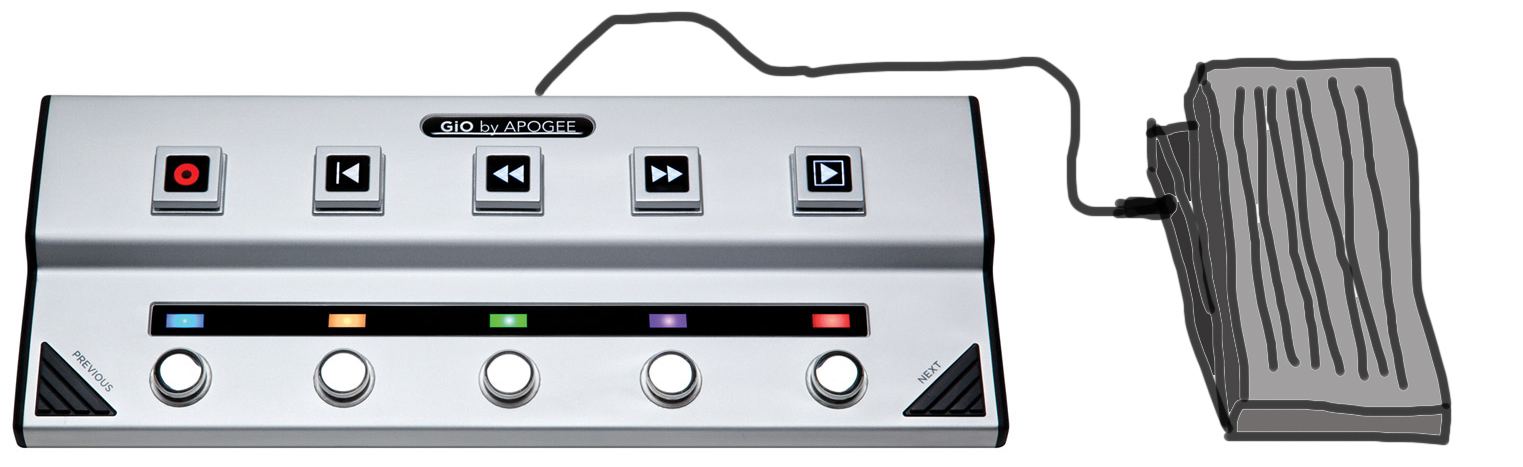 The Apogee GIO connected (and powered) via USB to the laptop for playing backing and loops, with my expression pedal connected to it for guitar bits.